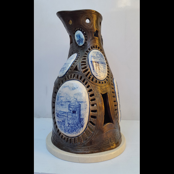 Bronce a la cera perdida con óvalos cerámicos pintados con óxidos y esmalte.Obra original